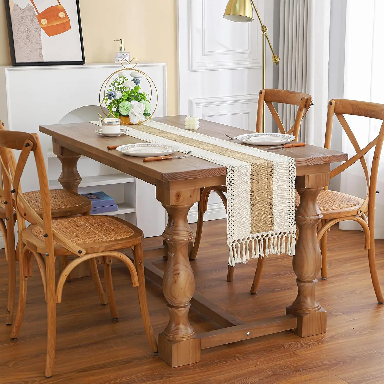 This boho farmhouse table runner features a soft linen blend with rustic macrame details and charming tassels, adding texture and warmth to your table setting. The natural burlap and cotton mix creates a relaxed, earthy look that complements both casual and elegant décor styles.