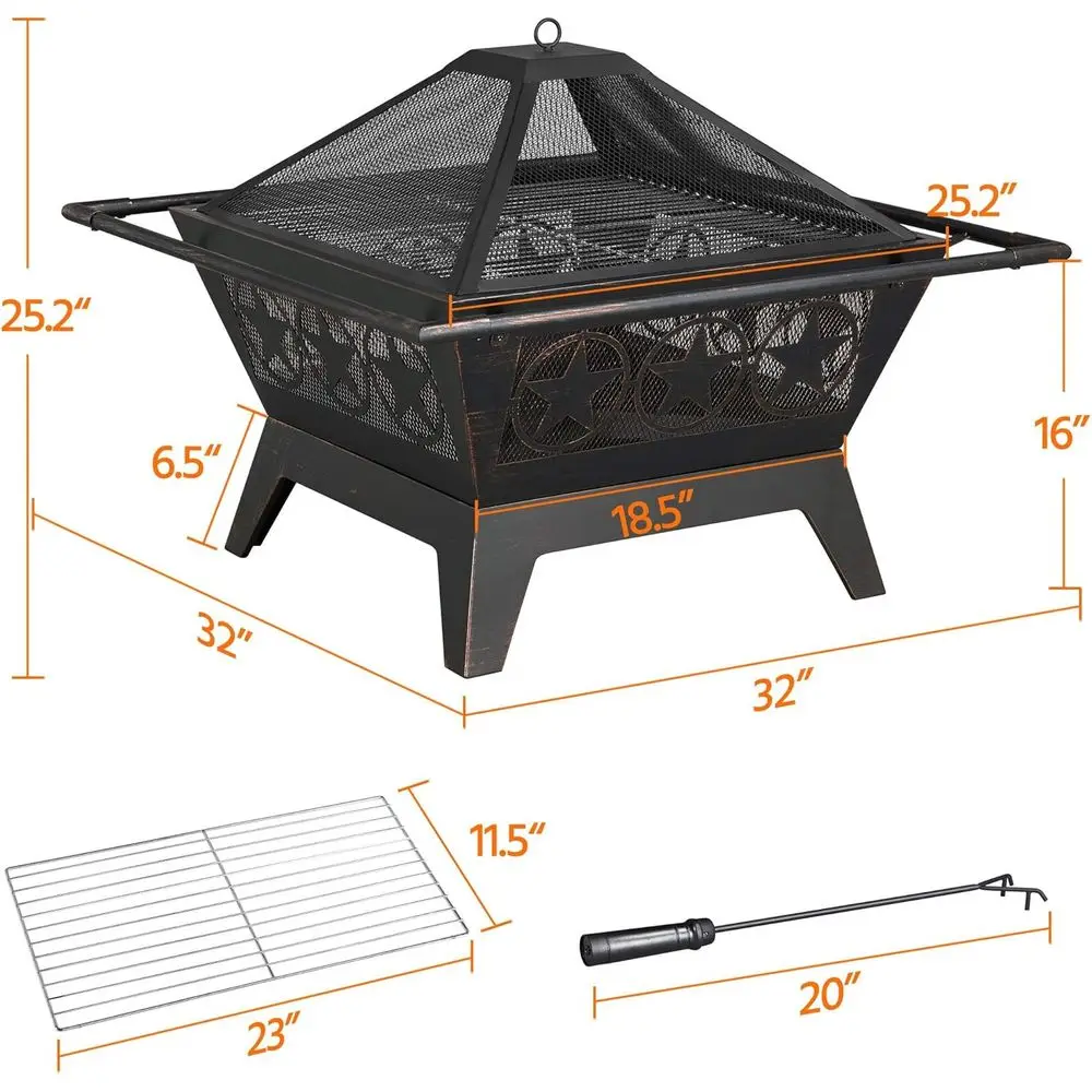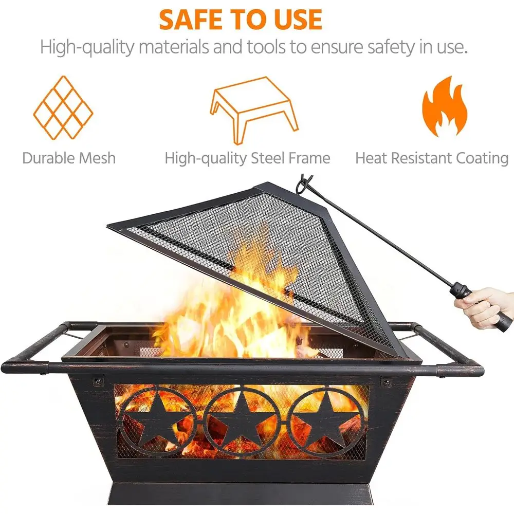 The included spark screen and mesh cover provide added safety while allowing the flames to shine, and the sturdy poker tool makes fire management simple and safe. Its classic square design pairs rustic charm with functional engineering, making it a statement piece that fits seamlessly in farmhouse patios, backyard lounges, or outdoor camping setups.